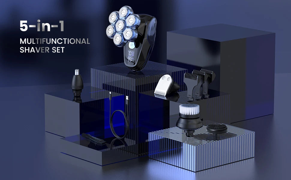 Package Includes: 1 x 7D Head Shaver, 1 x Hair Trimmer, 1 x Nose & Ear Trimmer, 1 x Facial Cleaning Brush, 1 x Soft Face Sponge, 3 x Trimming Comb(3mm/5mm/7mm), 1 x Type-C Charging Cable, 1 x Cleaning Brush, 1 x User Manual
