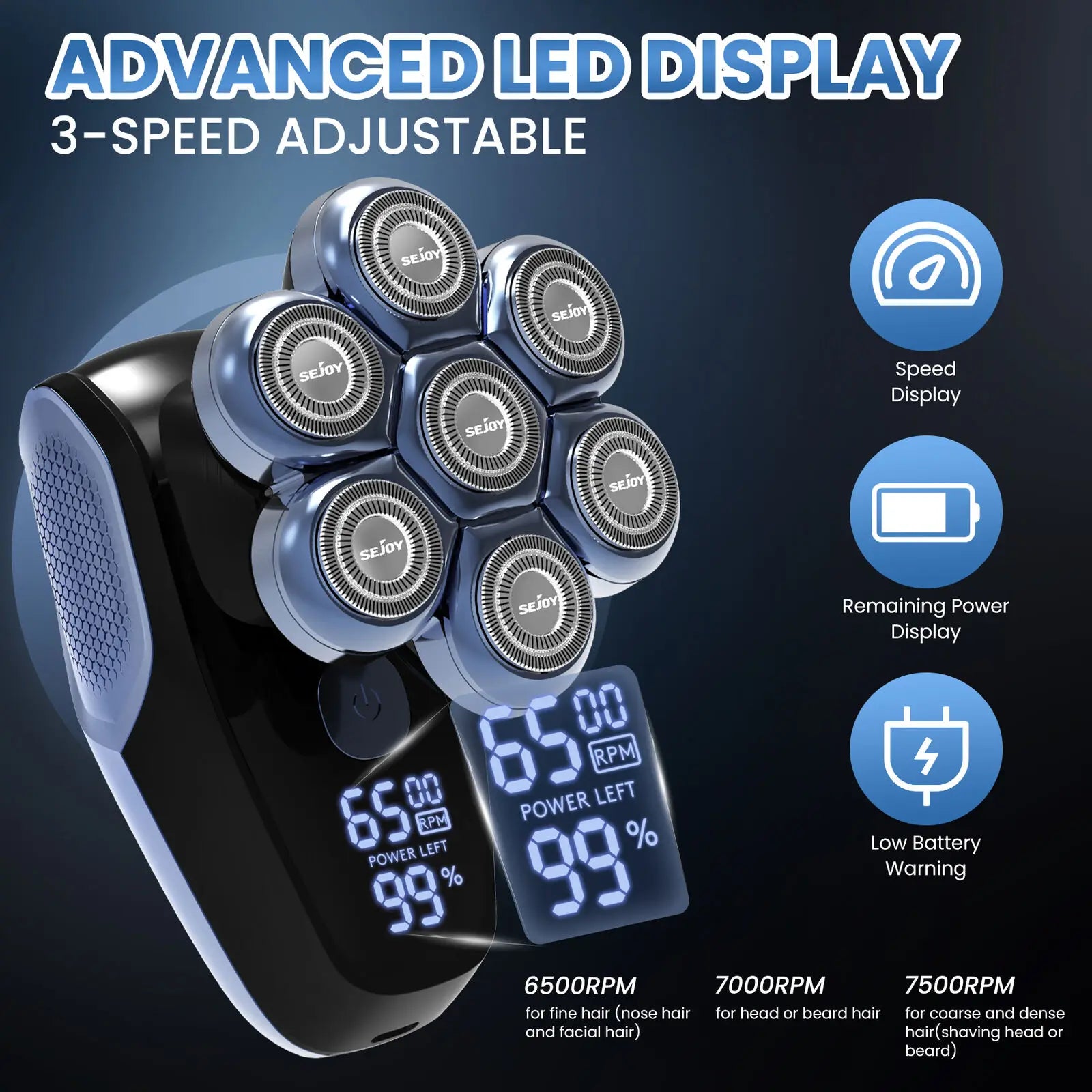 Features: Portable, IPX7 Waterproof, Dry Shave, Detachable Head, Ergonomic Design, Adjustable Speed, Cordless&Rechargeable, Quick Charging Time, LED Display