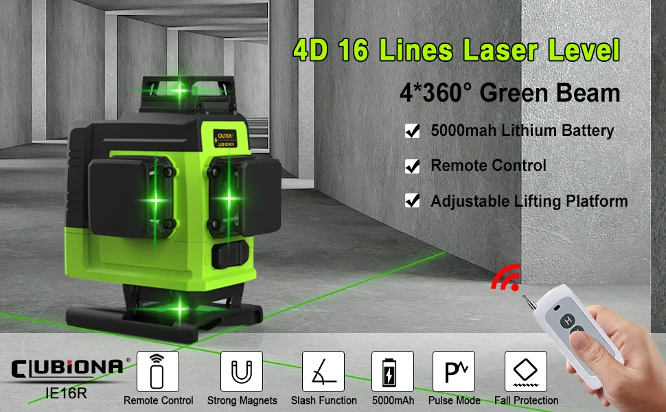 Conquer any leveling project with the CLUBIONA IE16R Powerful Green 16 Lines 4D Laser Level. This professional-grade tool delivers laser-sharp accuracy and unmatched versatility, empowering you to achieve flawless results in any environment. From intricate ceiling installations to perfect tile layouts, the IE16R makes precision leveling easier than ever.